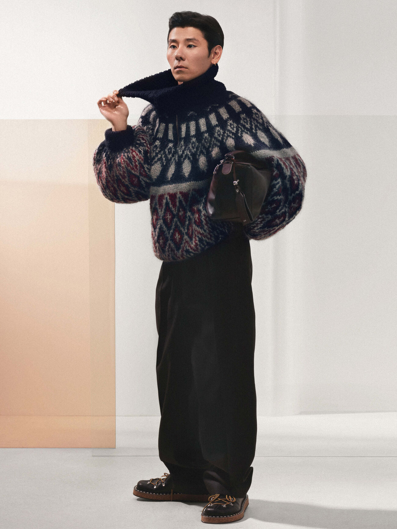 Des tissus légers associés à des tricots, des hauts décontractés, de la fourrure et des vestes amples composaient la collection, créant une esthétique à la croisée du loungewear et du défilé. Une masculinité douce, une sensualité décontractée et un certain romantisme se dégagent de la collection. Les teintes crème, beige sable, jaune tendre, rouge délavé, bleu poudré et rose subtil étaient au cœur de cette approche balnéaire.