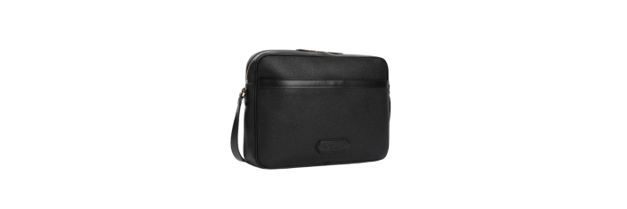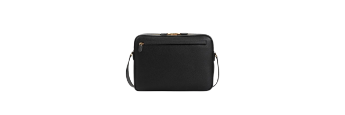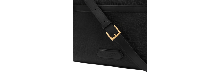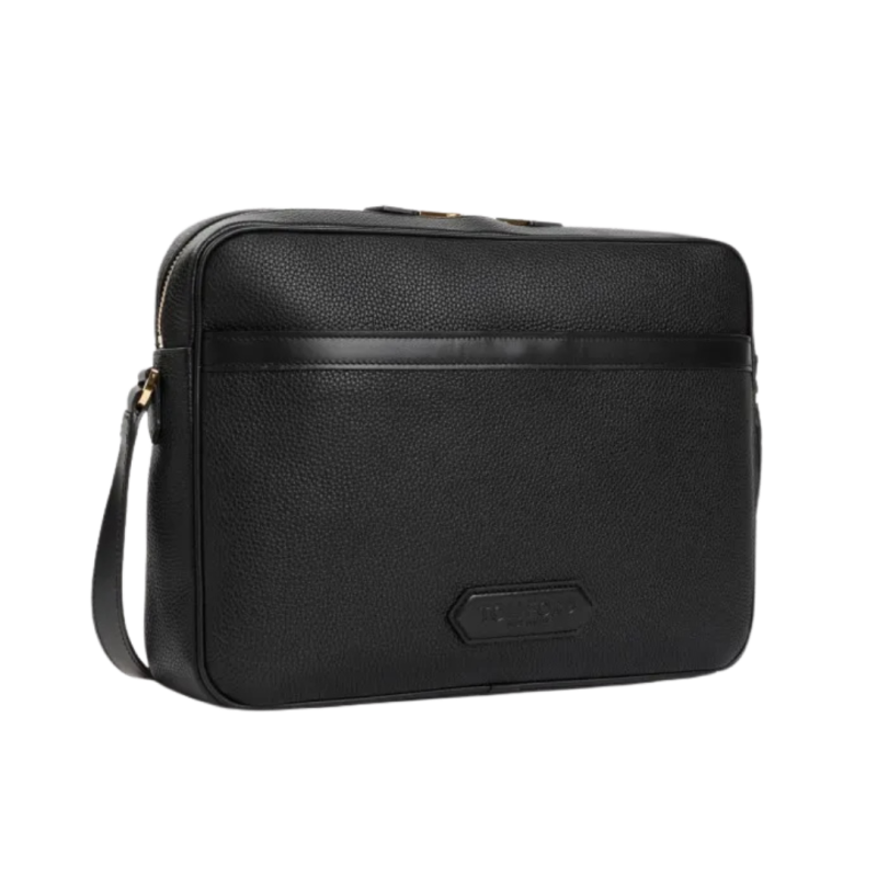 Sac messager Tom Ford en cuir de veau noir. Sac en cuir de veau noir pur, fermeture zippée à double sens sur le dessus, poche avant fendue, logo en cuir sur le devant, poche arrière zippée, bandoulière réglable, un compartiment principal, finitions dorées.