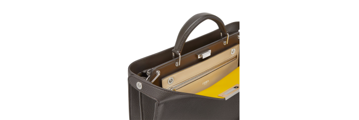 Sac Peekaboo ISeeU, moyen modèle, réalisé en cuir Cuoio Romano marron foncé avec intérieur contrasté jaune.