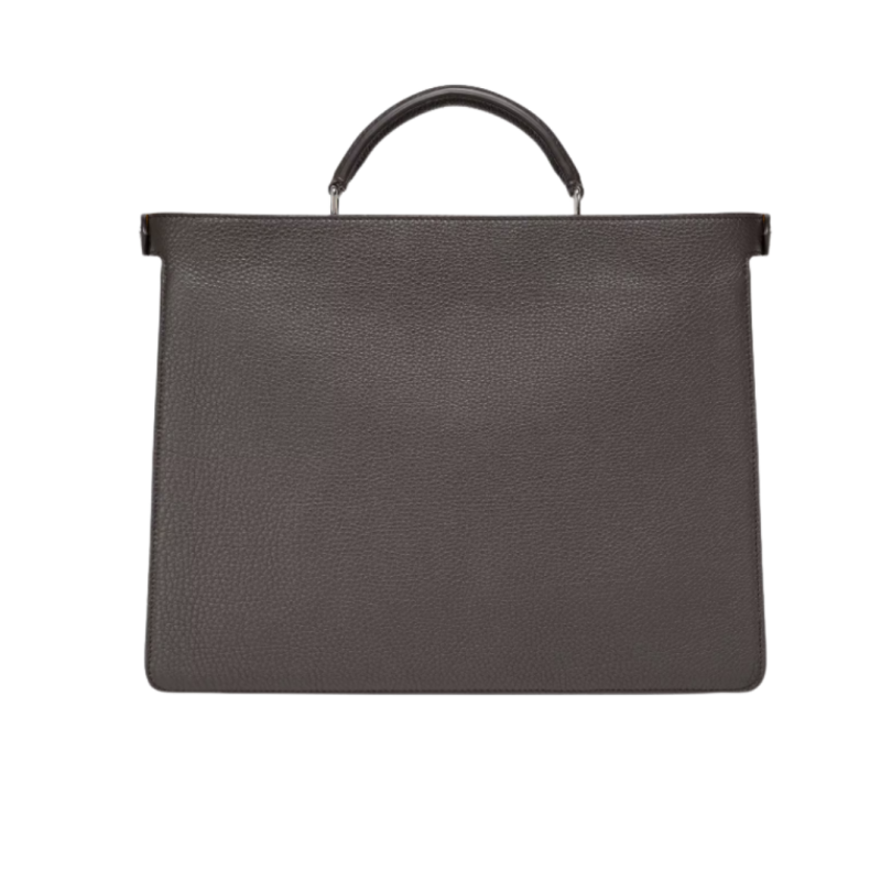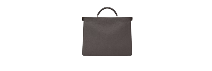 Intérieur composé de deux compartiments séparés par une paroi rigide et doté du fermoir-tourniquet emblématique de la marque sur le devant et d’une fermeture zippée au dos. La poche intérieure amovible présente un côté en cuir blanc lait et l’autre en toile FF marron. Garnitures en métal finition palladium.