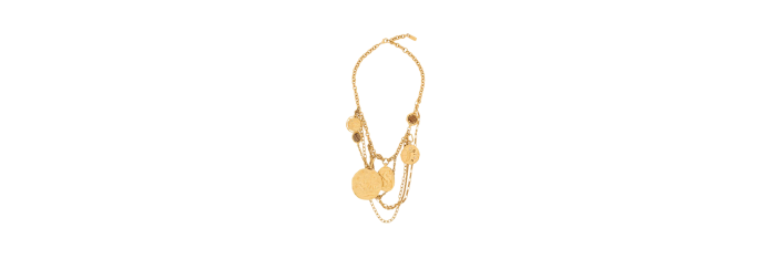 Réalisé en laiton bronze et doré, ce collier plastron multi-chaînes Chloé Medals est orné de médaillons aux formes et motifs variés, inspirés de l’héritage de la Maison. Ces derniers présentent différentes finitions texturées, façonnées à la main ou créées numériquement. Des logos Chloé et une plaque dorée Chloé signent la pièce.