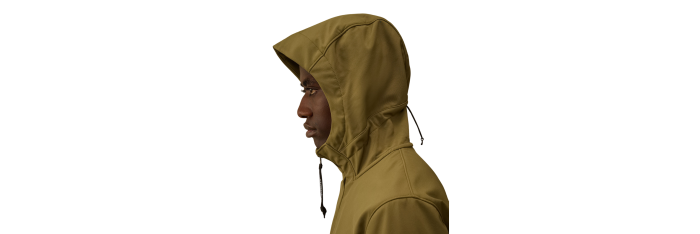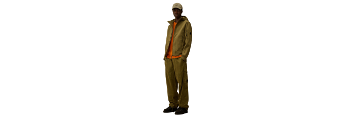 Veste à capuche confectionnée en C.P. Shell-R, un softshell extensible 3 couches multifilament recyclé. Confectionné à partir de fil de polyester recyclé, certifié par le Global Recycled Standard (GRS). La veste est dotée d'une capuche réglable, d'une fermeture à glissière intégrale bidirectionnelle, de poches latérales zippées et de la lentille emblématique de C.P. Company. Des poignets et un ourlet arrière côtelés complètent le design. Contrecollé pour une colonne d'eau de 5000mm, offrant une protection coupe-vent avec traitement anti-goutte. Coupe régulière.