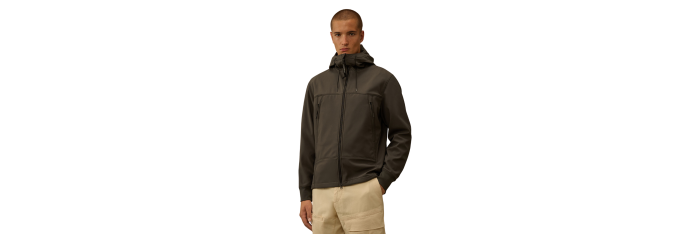 Veste Goggle confectionnée en C.P. Shell-R, un softshell extensible 3 couches multifilament recyclé. Confectionné à partir de fil de polyester recyclé, certifié par le Global Recycled Standard (GRS). La veste est dotée de la capuche Goggle emblématique de C.P. Company, d'une fermeture à glissière intégrale dans les deux sens et de poches latérales zippées. Contrecollé pour une colonne d'eau de 5000mm, offrant une protection coupe-vent avec traitement anti-goutte. Coupe régulière.