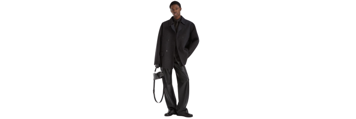 Manteau à double boutonnage modèle caban, avec col chemise et manches longues à épaules tombantes. Poches passepoilées diagonales pour se réchauffer les mains et poches basses à rabat sur le devant. Vêtement non doublé. En feutre de laine double mélangée de couleur noire.