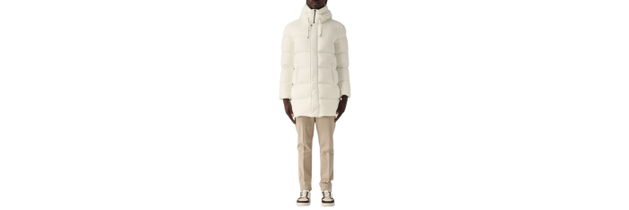 D'une texture douce et matelassée, elle est dotée d'une double fermeture à glissière avec boutons dissimulés, de poches latérales sur le devant et d'un rembourrage en duvet chaud.