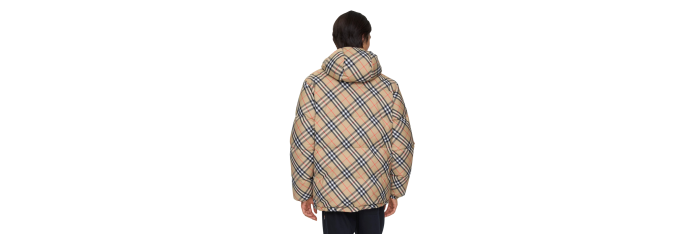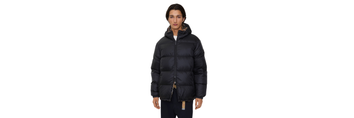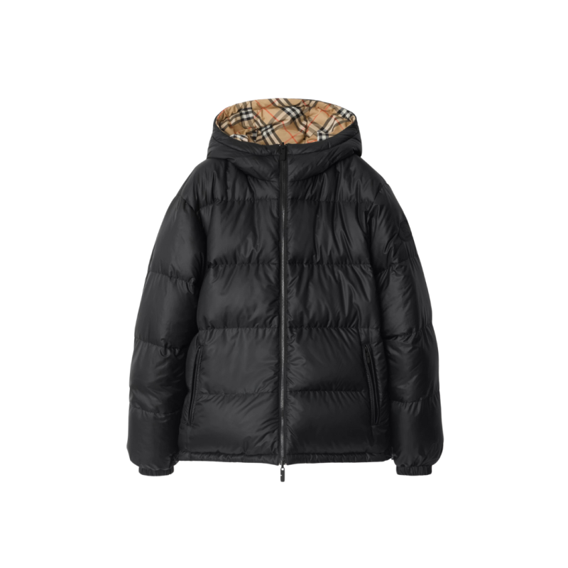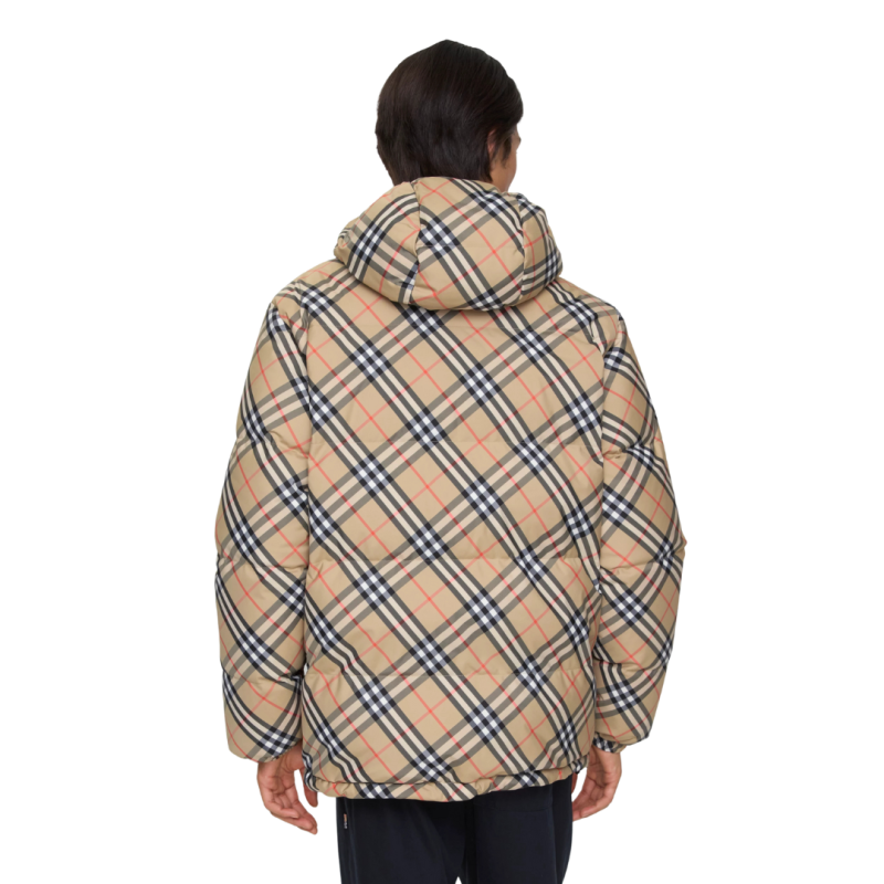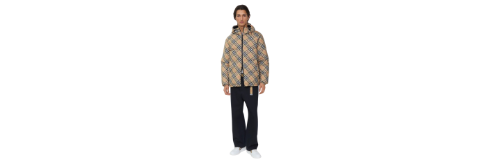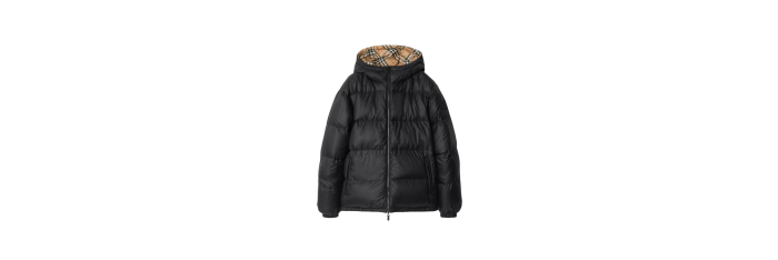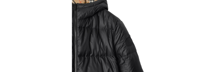 Cette doudoune casual à capuche est rembourrée de duvet et de plumes d'oie. Réversible, la pièce arbore les carreaux Burberry Check et une face unie en nylon ornée du cachet Knight, un motif d'archives introduit sur les sacs Burberry dans les années 1980.