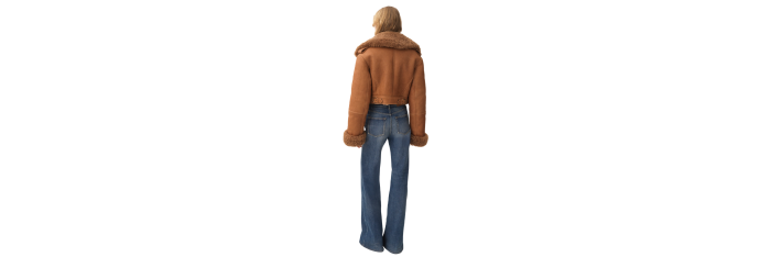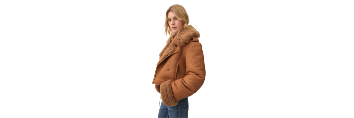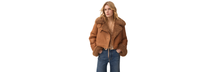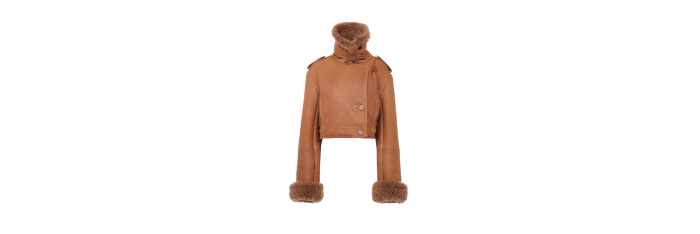 Veste courte droite en peau retournée de mouton islandais à finitions en shearling, avec col montant, boutons en corne gravés et pattes boutonnées aux épaules.