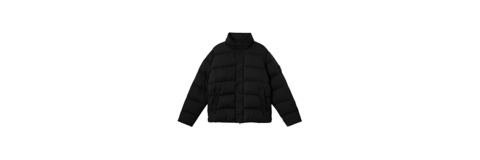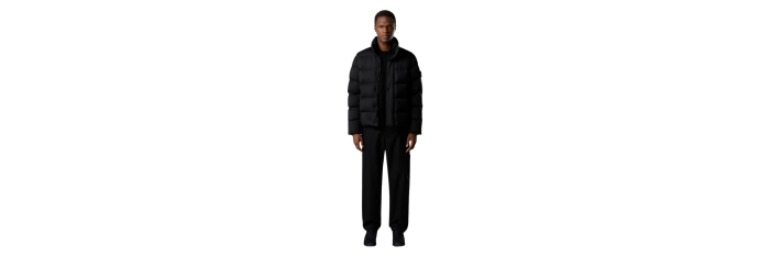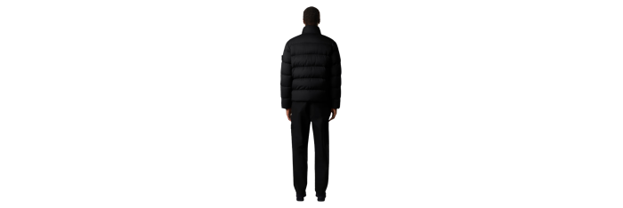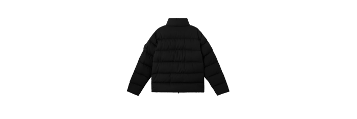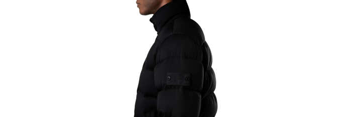 Col montant rembourré. Poches mains en biais à glissière dissimulée. Poche intérieure avec bouton et logo Compass brodé. Badge Stone Island Ghost sur la manche gauche. Poignets intérieurs côtelés et élastiqués. Cordon de serrage dans l’ourlet inférieur. Fermeture par glissière bidirectionnelle sous une patte à boutons-pression dissimulés ; un bouton-pression est visible sur l'extérieur.