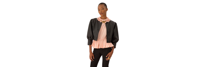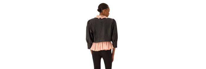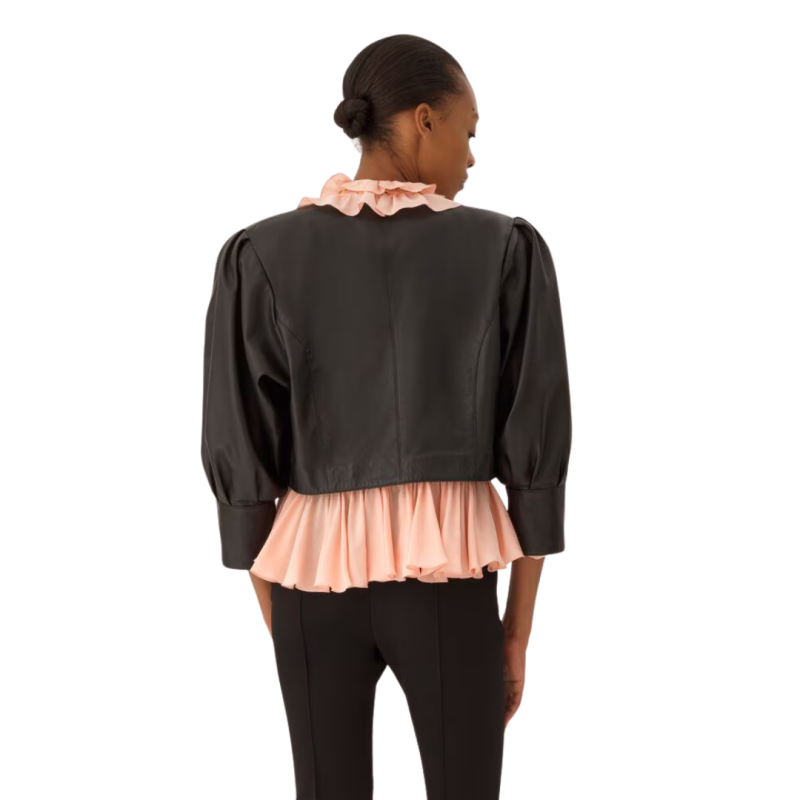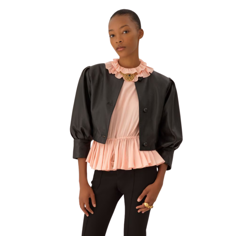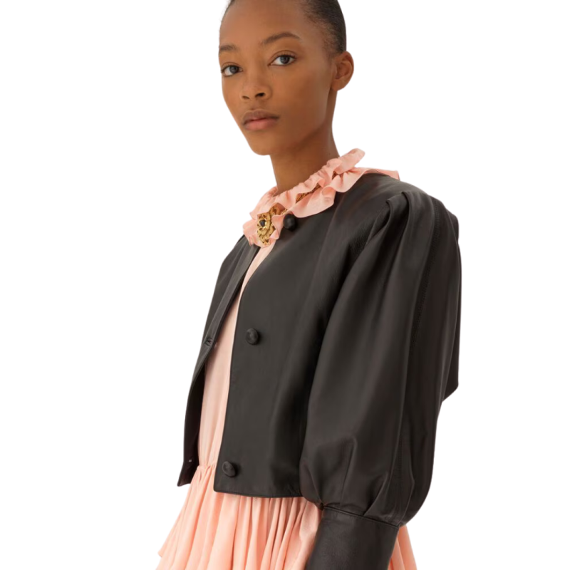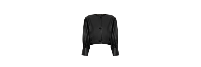 Veste courte sans col en cuir nappa plongé, avec manches trois-quarts bouffantes et boutons recouverts.