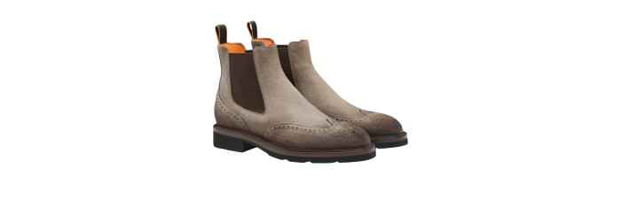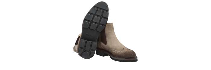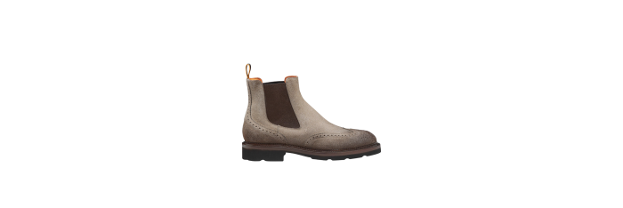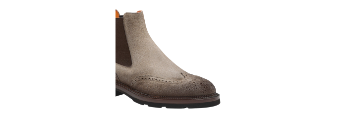 La bottine Chelsea est conçue pour unir un style classique à un caractère contemporain. Elle est confectionnée en daim haut de gamme, habillée de perforations Brogue et se dote d’élastiques d’aisance et d’un tirant pour la chausser plus facilement. Elle se distingue par sa forme structurée et légère, sa semelle multicouche composée d’une trépointe en cuir ainsi que par sa semelle d’usure crantée en caoutchouc.