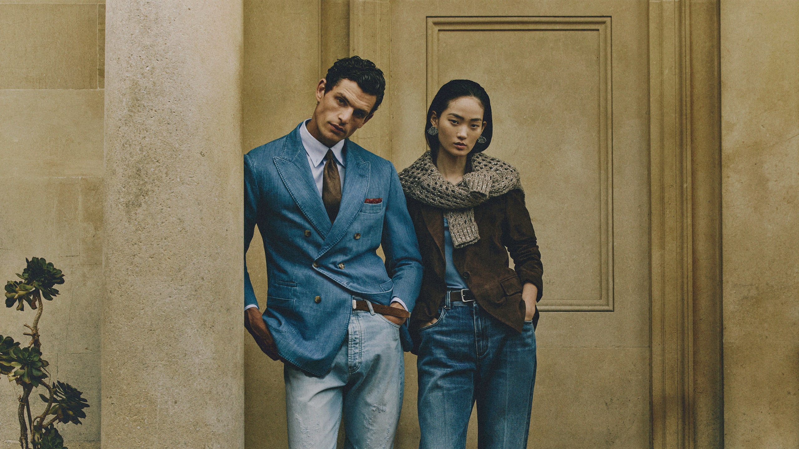 Veste demi croisée flanelle soie laine cachemire mouchetée carreaux beige