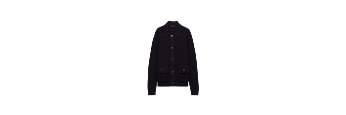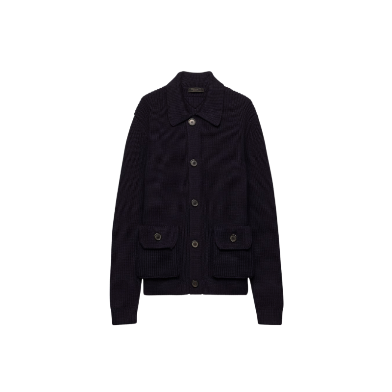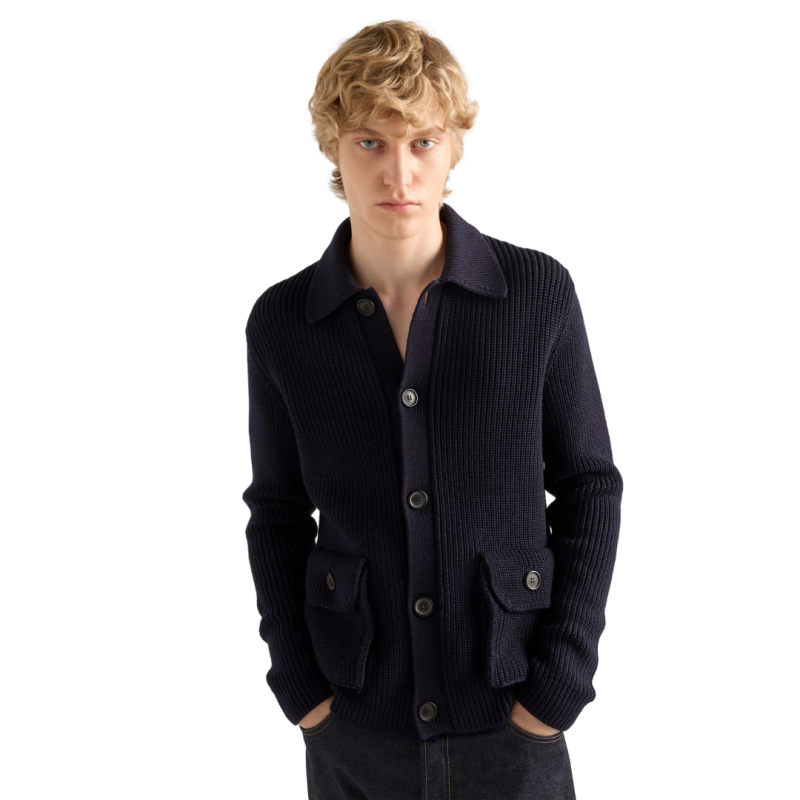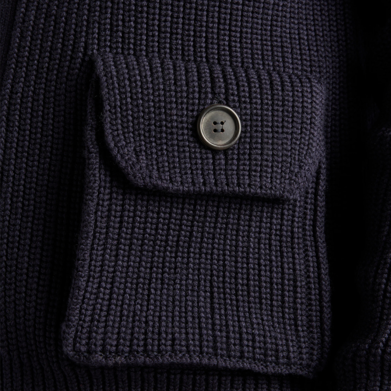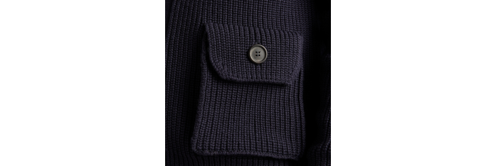 Cardigan à boutons laine côtelée bleu marine col chemise poches