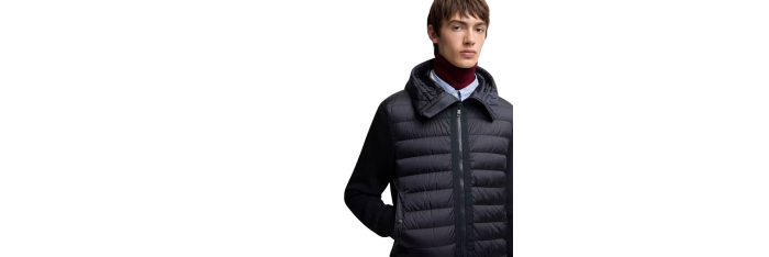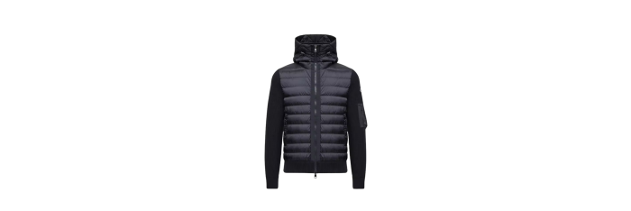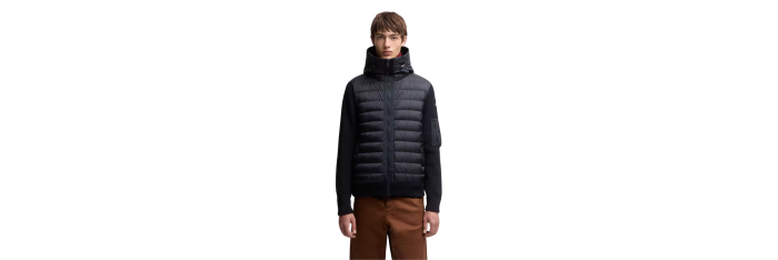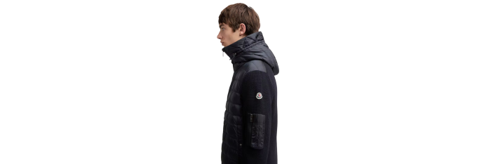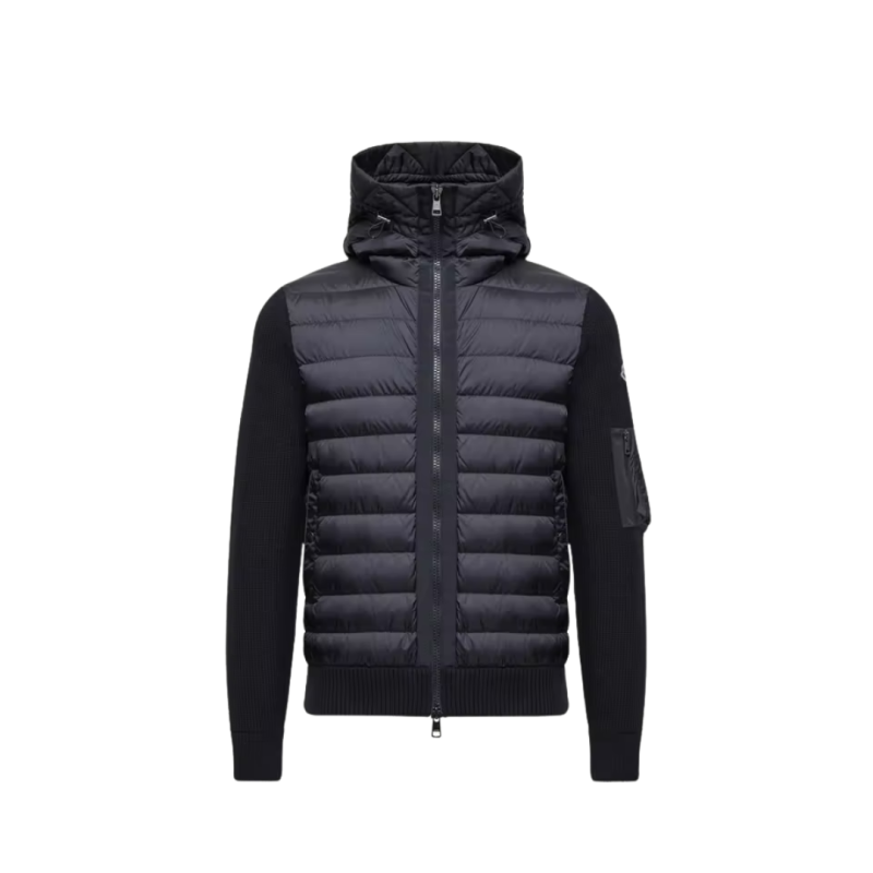 MONCLERCardigan à capuche zippé matelassé bi matière laine nylon bleu marine