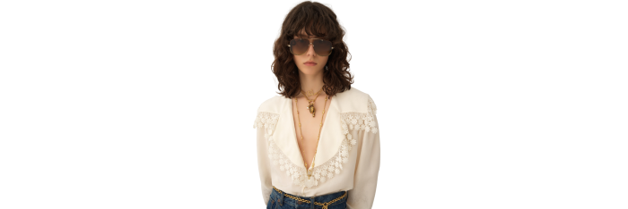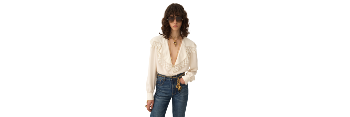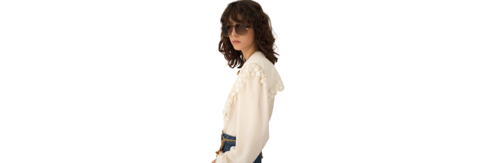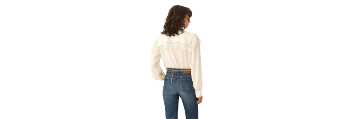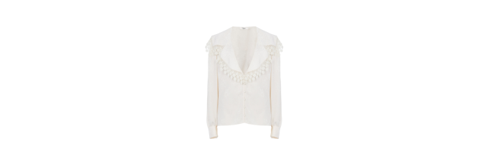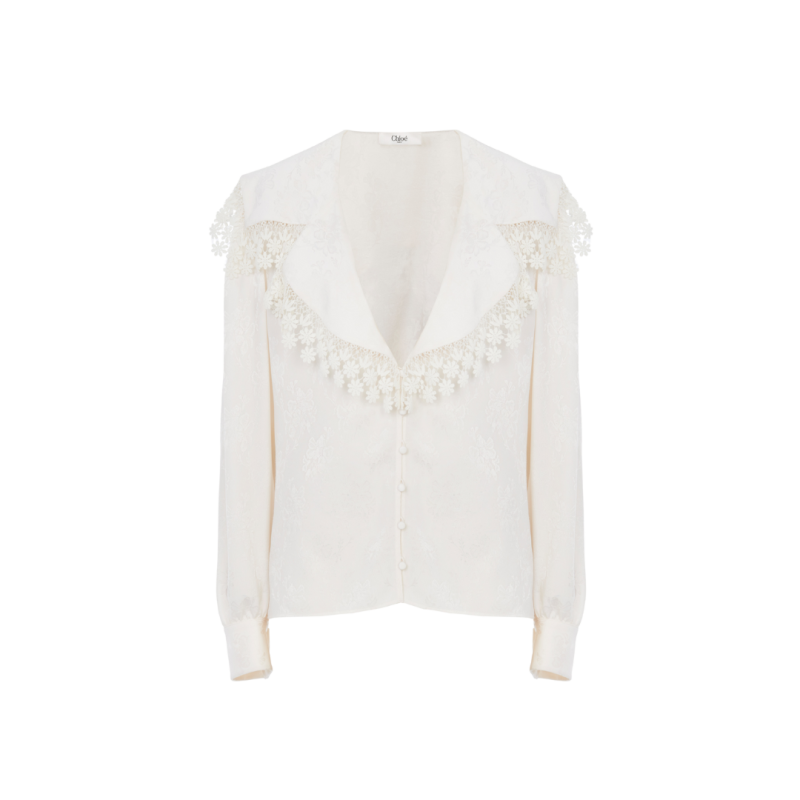 Blouse à col oversize en jacquard floral mat et brillant de soie biologique, avec finitions en dentelle florale et boutons recouverts.