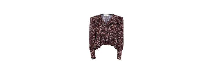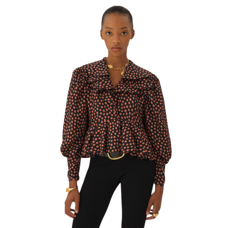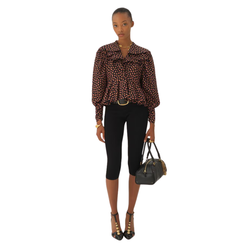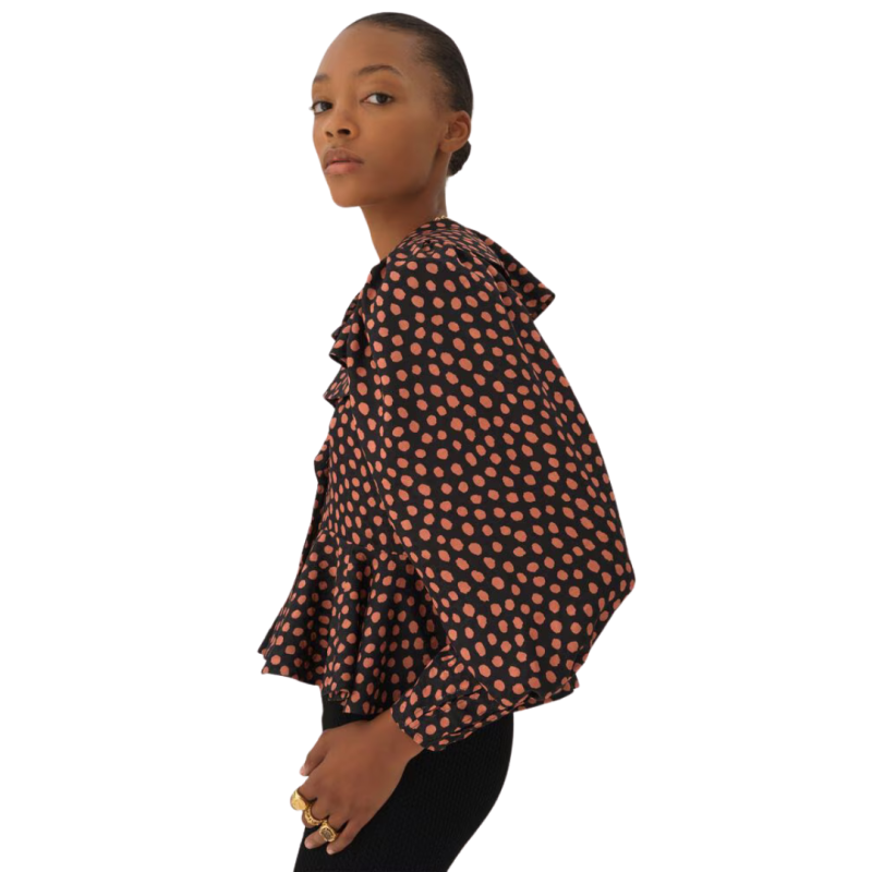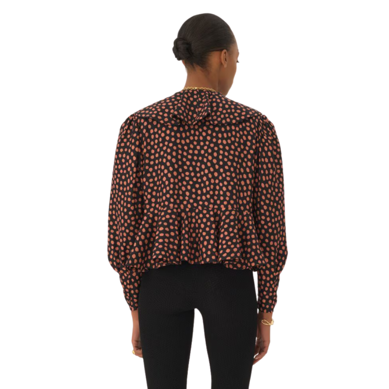 CHLOETop court col V oversize soie jacquard noir imprimé pois rose volants