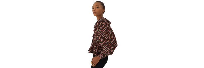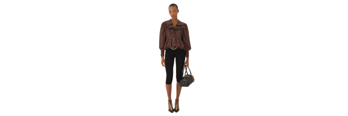 Top court col V oversize soie jacquard noir imprimé pois rose volants