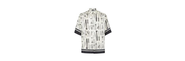 Chemise à manches courtes coupe large. Col semi-italien et bas droit. Fermeture avec boutons recouverts. Réalisée en pure soie dans les tons blancs, elle est ornée de l’imprimé contrasté Fendi Tools représentant les outils des artisans Fendi. Rehaussé de bords noirs sur le bas des manches et le bas du modèle.