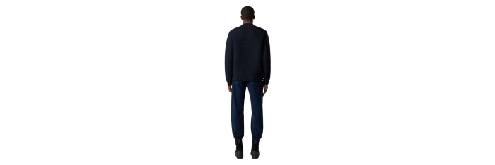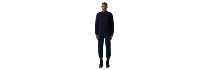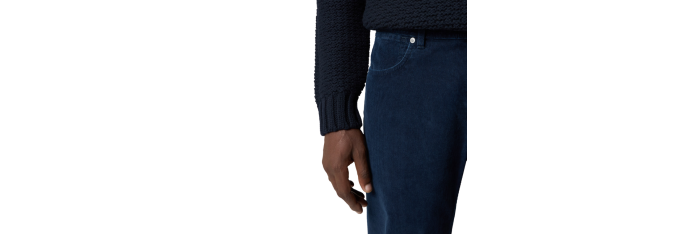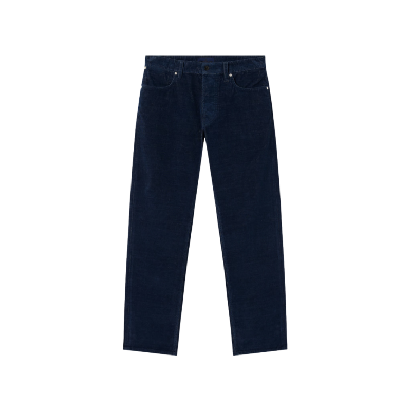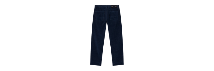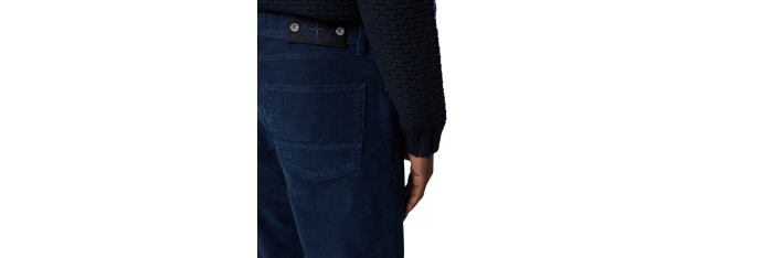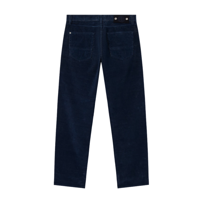 Jean à cinq poches en velours finement côtelé composé de coton teint à l’indigo et de polyester blanc, directement inspiré des couleurs du denim et doté d'une texture striée distinctive. Le vêtement fini est rincé. L'application de colorant indigo sur le velours côtelé, un matériau généralement non associé à ce traitement, reflète le dévouement continu de Stone Island à l'innovation textile.