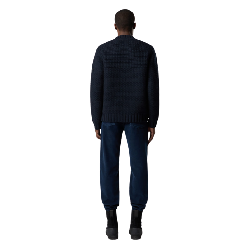 Poches mains incurvées avec poche à monnaie sur le côté droit et petite étoile brodée sous la poche gauche. Au dos, au niveau de la taille, badge Stone Island Denim Research avec boutons en métal. Poches arrière plaquées avec fond doublé renforcé et surpiqûre horizontale. Braguette boutonnée dissimulée avec bouton supérieur noir apparent. Coupe droite regular.