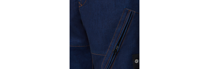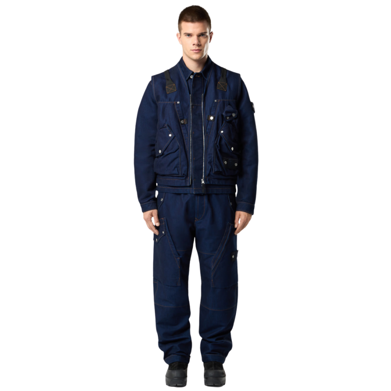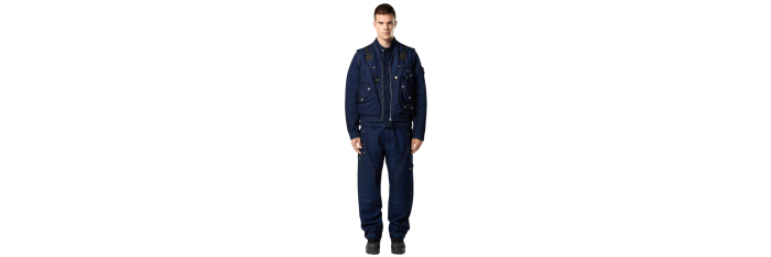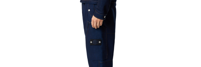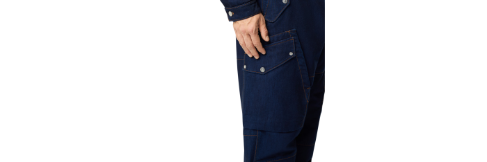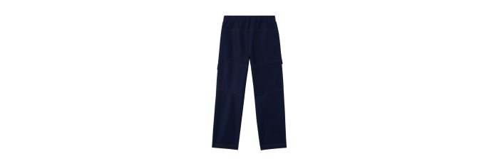 Le polypropylène est l'une des fibres les plus légères qui existent, en partie grâce à sa structure creuse. Même les vêtements très volumineux fabriqués avec ce matériau sont étonnamment légers. Pantalon cargo confectionné dans une tela de denim ultralégère 7 oz, tissée en sergé 3/1 à partir de fils de coton teint à l’indigo et de fils de polypropylène. Le résultat est un denim à l'aspect traditionnel, mais nettement plus léger. Le vêtement fini est rincé.