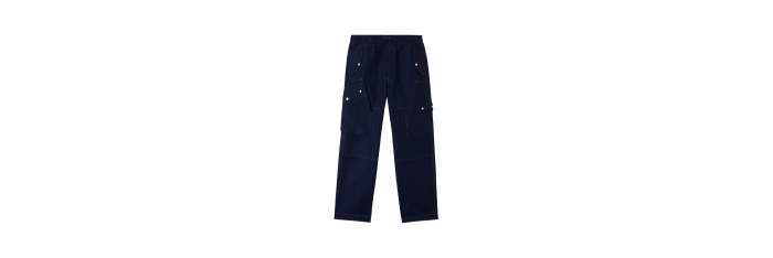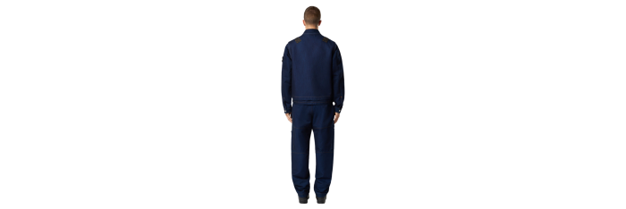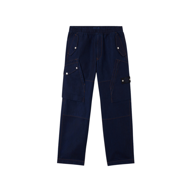Poches mains en biais à rabat triangulaire pressionné. Sur la jambe gauche, grande poche à soufflet en biais avec glissière dissimulée et badge Stone Island Denim Research avec boutons en métal. Sur la jambe droite, une grande poche à soufflet avec rabat triangulaire et trois boutons-pression sur la deuxième poche avec ouverture en biais et bouton-pression dissimulé. Empiècement au dos, sous la taille, avec doublure intérieure. Cordon de serrage en bande de nylon aux chevilles. Surpiqûres contrastantes sur l’ensemble du vêtement. Taille élastiquée à cordon de serrage intérieur. Braguette zippée. Coupe ample.