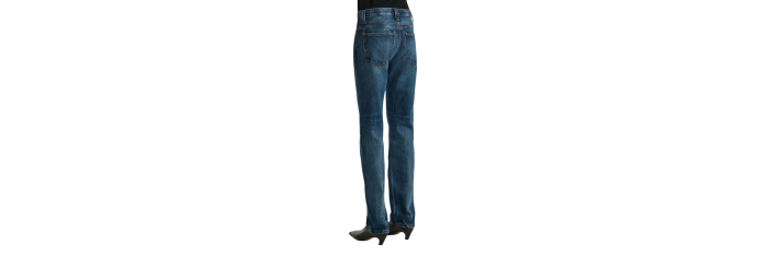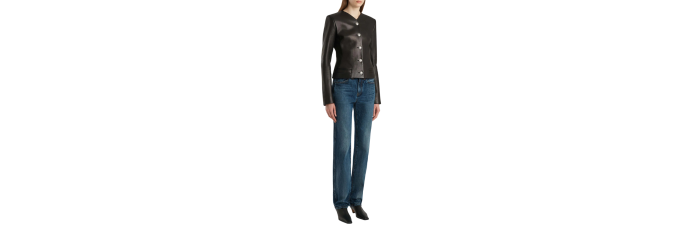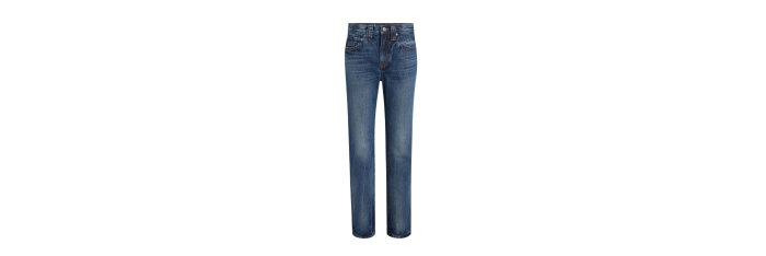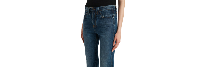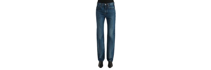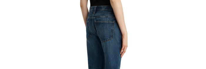 Inspirée des photos de top-modèles des années 90 en congé, cette silhouette droite apporte une touche de décontraction au denim rigide. La taille mi-haute est conçue pour arriver juste sous le nombril, avec des lignes carrées et épurées. Chaque jean, fini à la main, est orné d'un bouton en nickel vieilli.