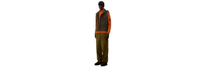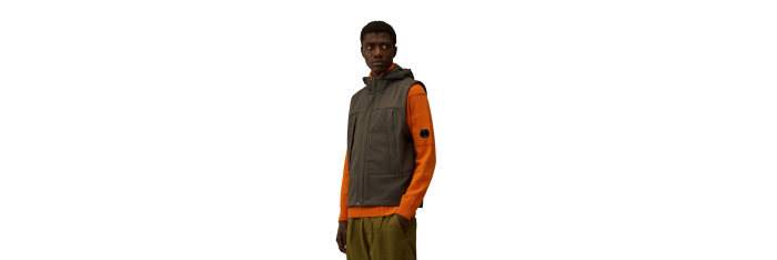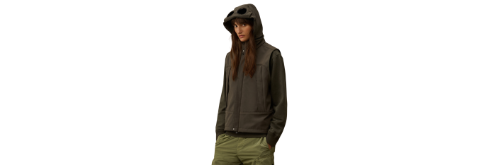 Gilet pour lunettes confectionné en C.P. Shell-R, un softshell extensible 3 couches multifilament recyclé. Confectionné à partir de fil de polyester recyclé, certifié par le Global Recycled Standard (GRS). Le gilet est doté de l'emblématique capuche Goggle de C.P. Company, d'une fermeture à glissière intégrale bidirectionnelle cachée et de poches latérales zippées. Coupe-vent avec traitement anti-goutte. Contrecollé pour une colonne d'eau de 5000 mm, offrant une protection coupe-vent avec traitement anti-gouttes. Coupe régulière.
