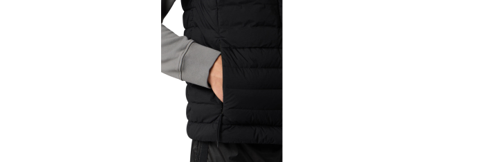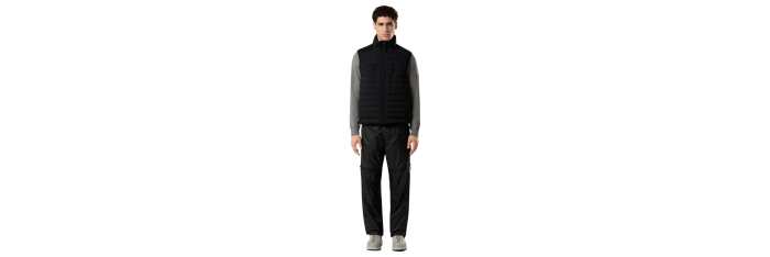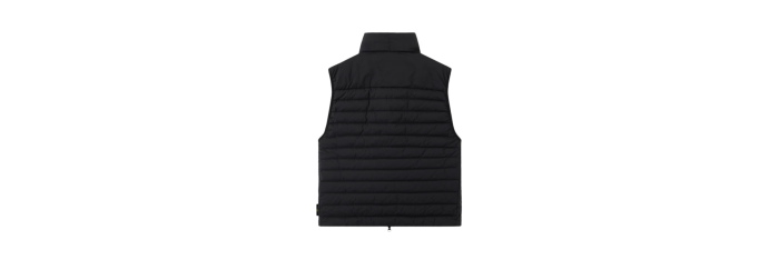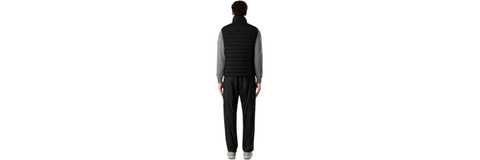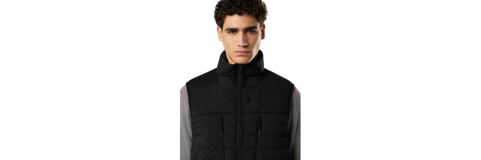Doudoune sans manches en une seule couche de nylon léger et extensible, réalisée grâce à une technique de tissage spéciale qui forme automatiquement les compartiments à plumes directement sur le métier à tisser. Les tunnels à plumes sans coutures augmentent considérablement le maintien du duvet. Le vêtement fini est rembourré par injection directe avec les plumes les plus fines, traitées spécifiquement pour résister à la teinture en pièce. Teinture du vêtement avec l'ajout d'un agent déperlant spécial. Certification RDS (Responsible Down Standard).
