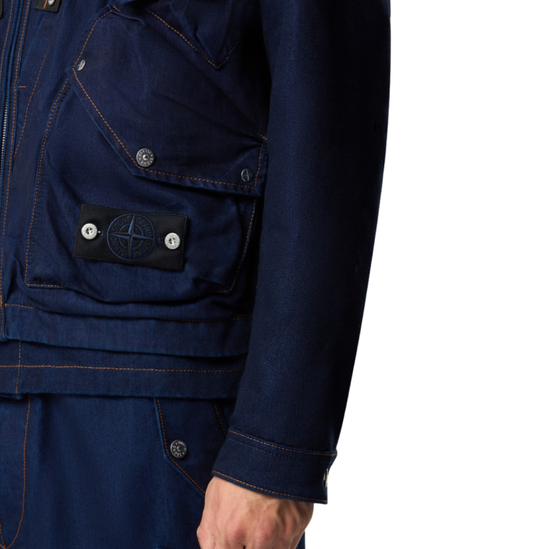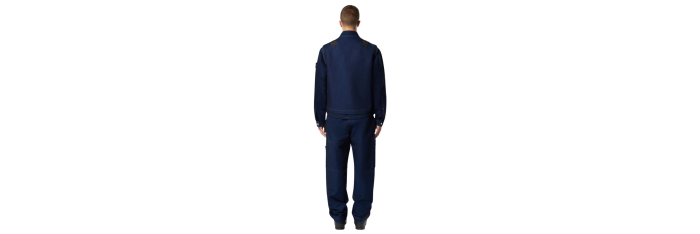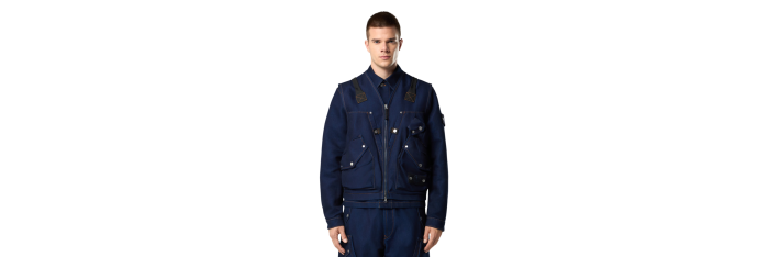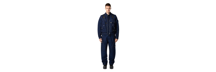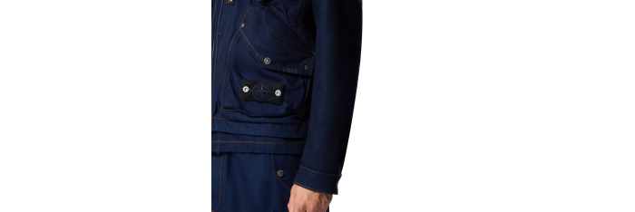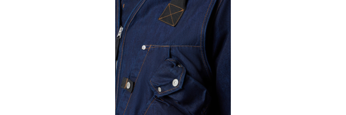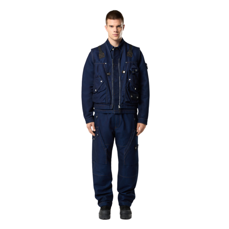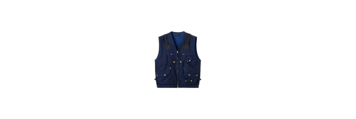 Le polypropylène est l'une des fibres les plus légères qui existent, en partie grâce à sa structure creuse. Même les vêtements très volumineux fabriqués avec ce matériau sont étonnamment légers. Gilet utilitaire fabriqué à partir d'une tela de denim ultralégère 7 oz, tissée en sergé 3/1 composé de fil de coton teint à l'indigo et de fil de polypropylène. Le résultat est un denim à l'aspect traditionnel, mais nettement plus léger. Le vêtement fini est rincé.