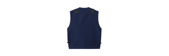 Gilet utilitaire en tela de denim ultralégère 7 oz, tissée à partir de fils de coton et de polypropylène teints à l'indigo, avec des détails de bandes, des poches à rabat et des surpiqûres contrastantes. Vêtement rincé.