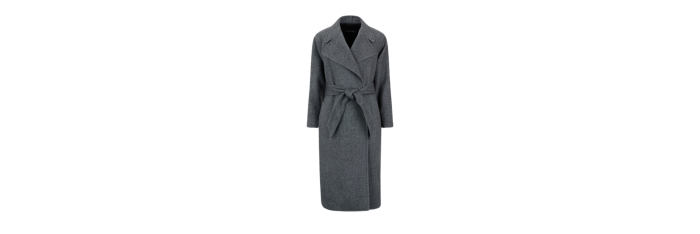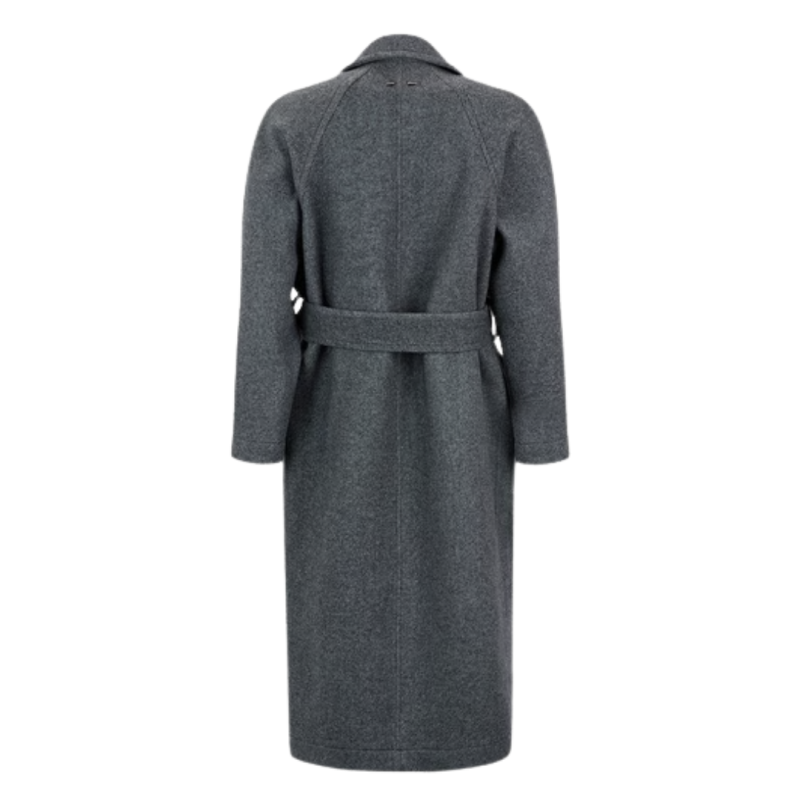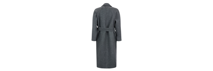 Manteau long croisé sergé laine rayé noir blanc ceinture à nouer