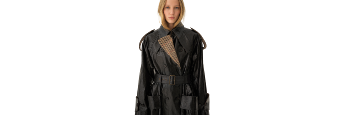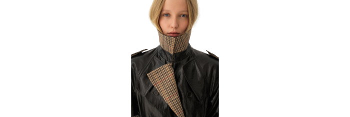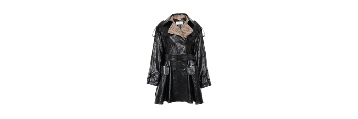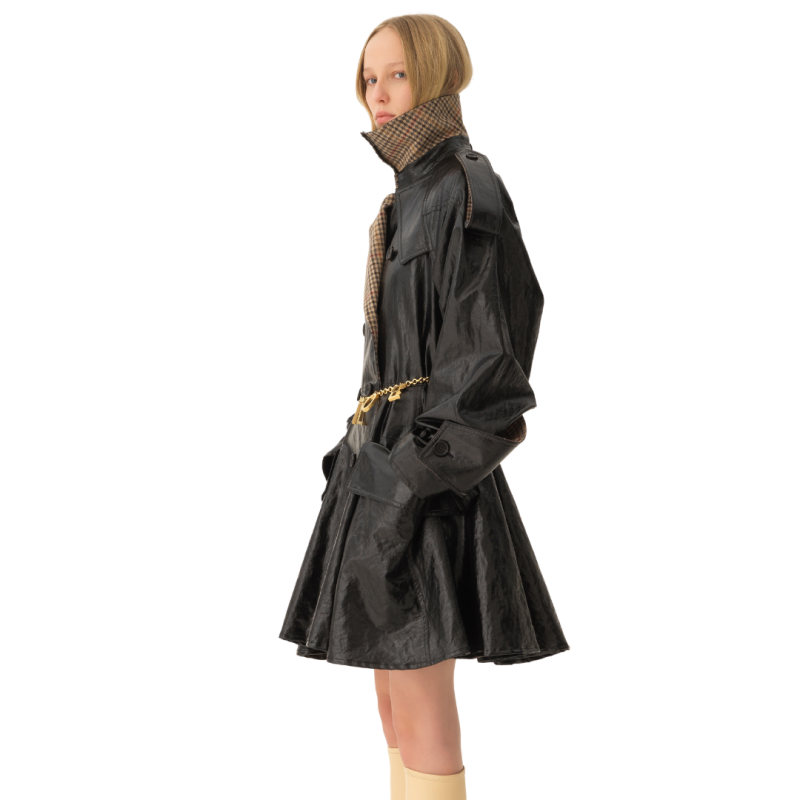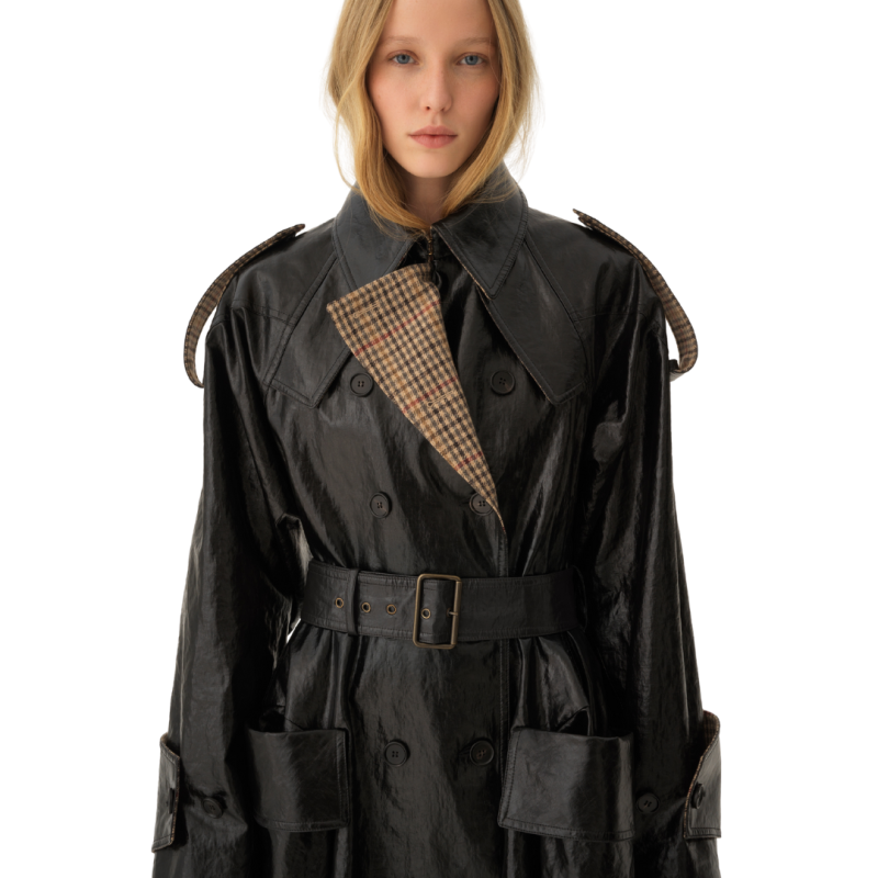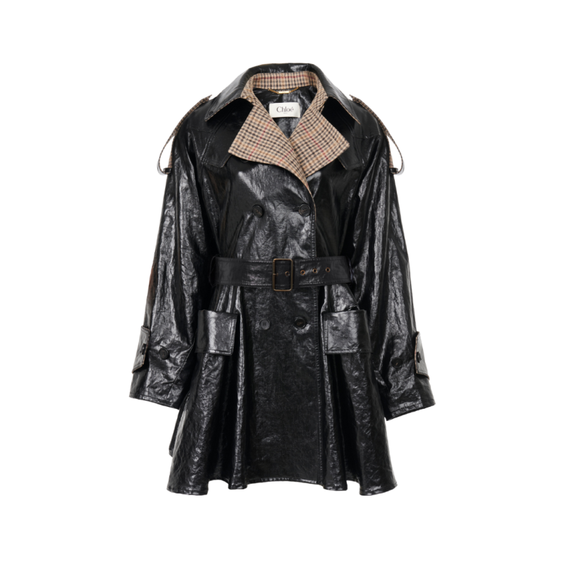 Manteau cavalier court croisé en lin enduit léger, avec doublure à carreaux et boutons en corne gravés. Des poches à rabat et une ceinture à boucle et anneaux en D dorés complètent la pièce.