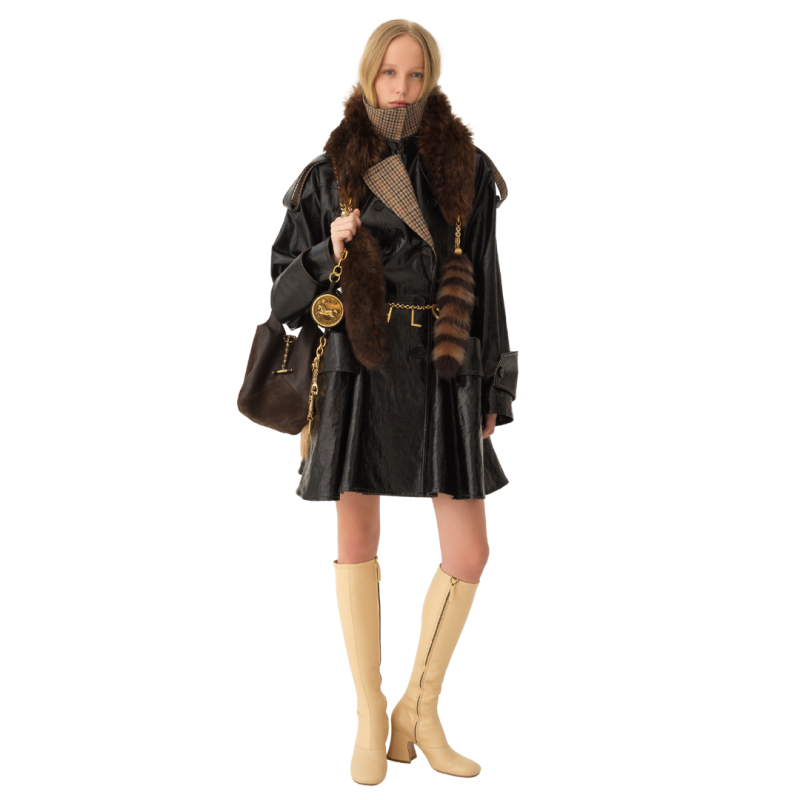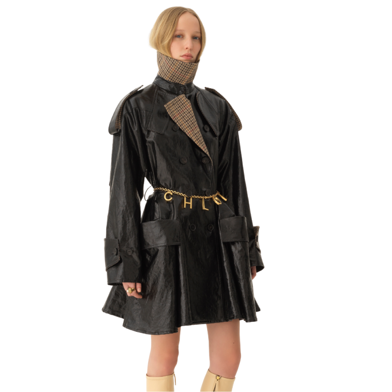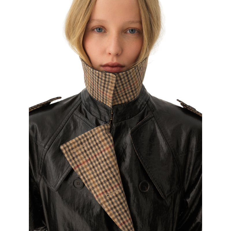 CHLOEManteau cavalier court croisé lin enduit noir col revers carreaux beige