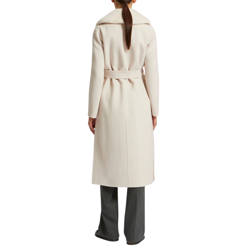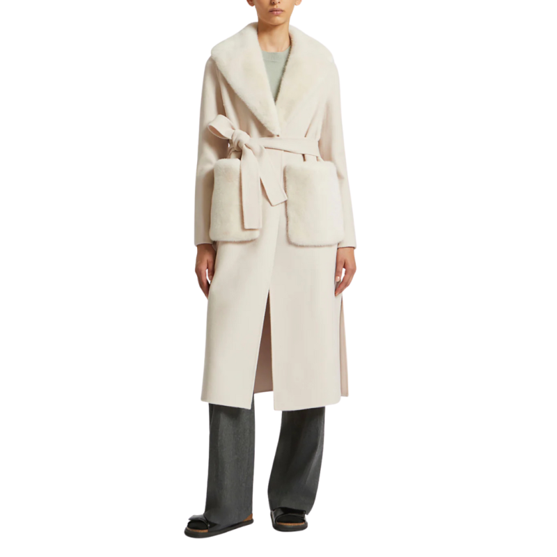 Manteau ceinturé lainage cachemire blanc col poche fourrure vison