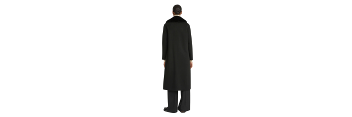 Manteau long et fendu sur les côtés confectionné en lainage cachemire double-face. Doté d’un col tailleur, de deux poches plaquées et d’une ceinture pour ajuster la silhouette, ce modèle joue avec les codes du masculin féminin. Un style qui peut se transformer au cours de la journée en ajoutant un col ainsi que des sur-poches en fourrure de vison amovibles. Des détails élégants qui s’attachent parfaitement à ce manteau versatile grâce à un système de boutons.