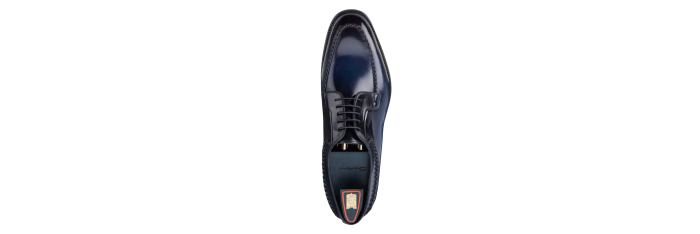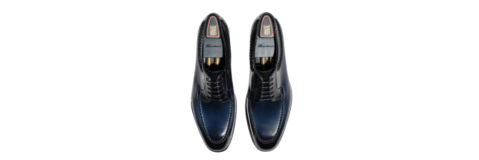 Icône d’élégance et de raffinement, le derby en Édition limitée de la collection Meraviglia incarne le savoir-faire artisanal sous sa forme la plus authentique. Doté d’un design robuste et harmonieux, il est réalisé en cuir orné de velature faites à la main, qui dévoilent les facettes intenses et lumineuses de la couleur Blu Meraviglia. Les coutures en cuir tressé sur le plateau et le col sont une ode à la beauté du savoir-faire. Sa construction Goodyear garantit une excellente résistance. La semelle de propreté et la semelle sont agrémentées de l’emblème Santoni Culture, An Emblem of Mastery, ce symbole résume la quintessence de la marque et rend hommage aux maîtres artisans qui ont façonné le style Santoni.