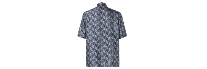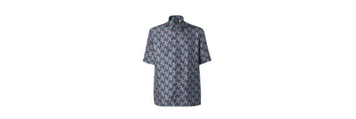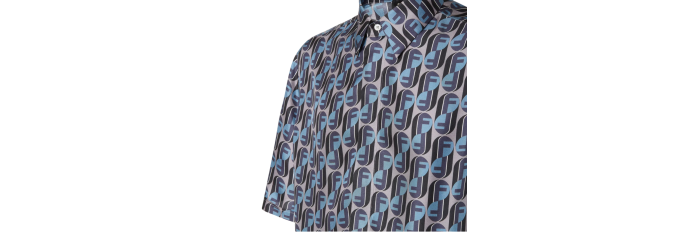 Chemise à col semi-italien et manches courtes. Coupe boxy. Fermeture par boutons dissimulés. En soie ornée de l’imprimé Fendinity all-over dans les tons bleu, noir et taupe.