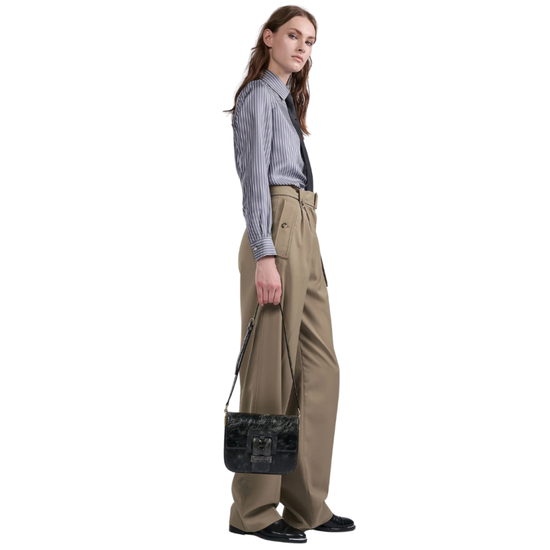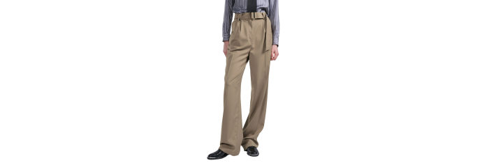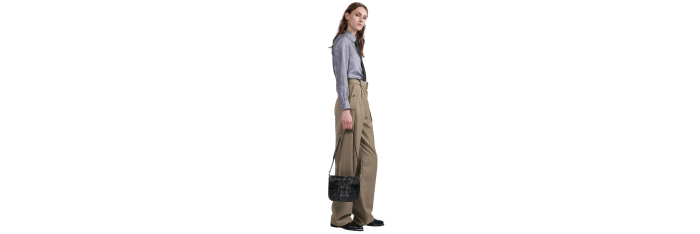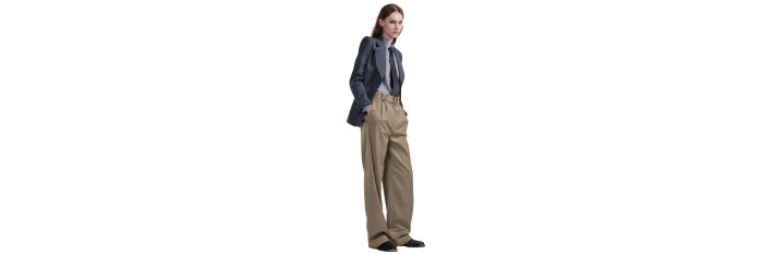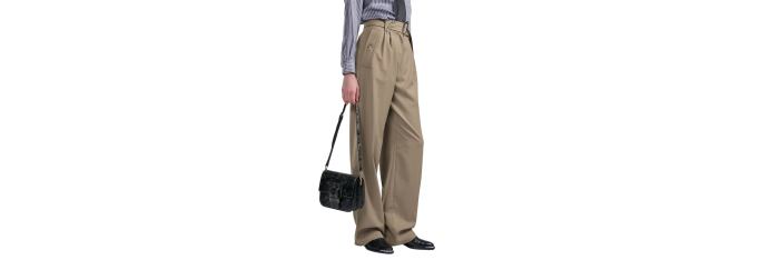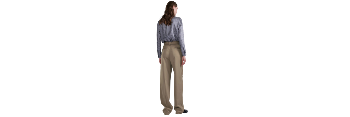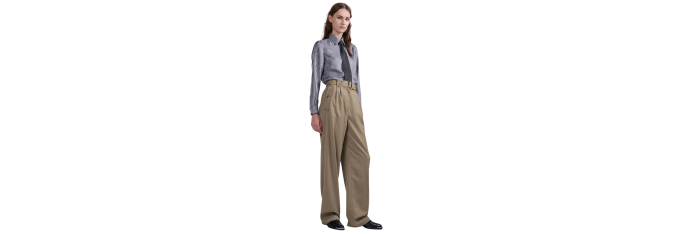 Épicentre de la silhouette, ce pantalon à plis insuffle une attitude chic et nonchalante à vos looks favoris. Adoptant une coupe taille haute à jambe large pour conjuguer féminité et accents androgyne, ce pantalon femme se décline dans une confortable gabardine de laine stretch dans trois coloris : noir, bleu denim ou camel. Sa ceinture intégrée est parfaitement maintenue à l'aide d'une boucle de serrage carrée et de passants boutonnés, des détails au chic utilitaire qui ne sont pas sans rappeler les éléments traditionnellement associés au trench-coat. Ses poches passepoilées à l'arrière et ses poches frontales sont elles aussi dotées de boutons choisis dans une version noire minimaliste ou dans un effet corne pour le modèle camel.