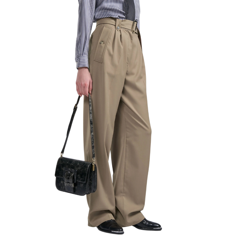 Pantalon taille haute gabardine laine stretch camel ceinture poches