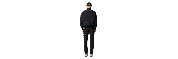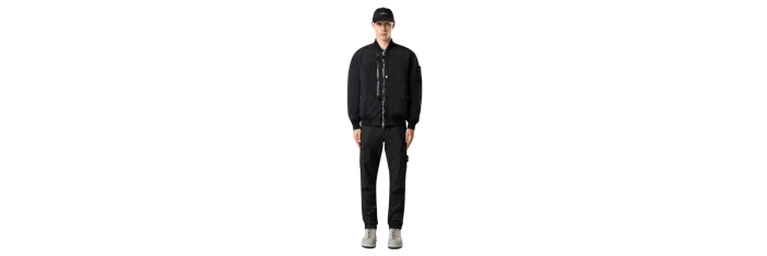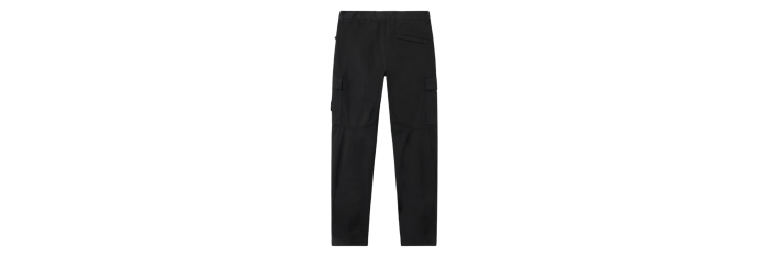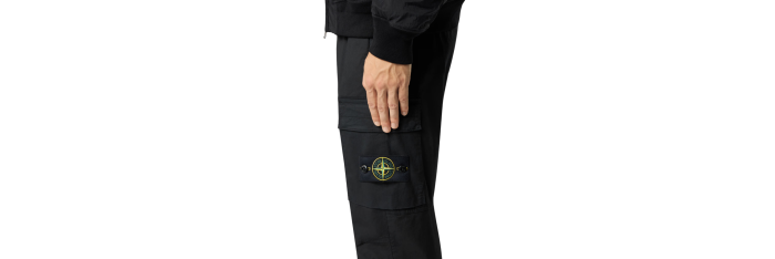Poches mains verticales à glissière dissimulée. Poche à bouton-pression sous rabat fixe au dos. Poche à soufflet et à rabat sur chaque jambe avec boutons-pression dissimulés ; la poche gauche est ornée du badge Stone Island. Genoux galbés. Braguette zippée et boutonnée. Coupe fuselée regular.