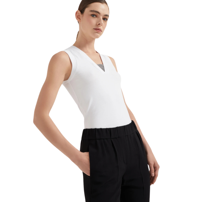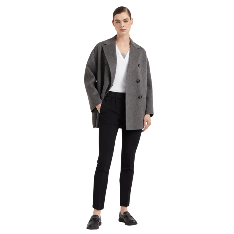 Tissu classique des collections Brunello Cucinelli, le crêpe cady de soie et acétate se distingue par un aspect légèrement froissé et une texture très légère.