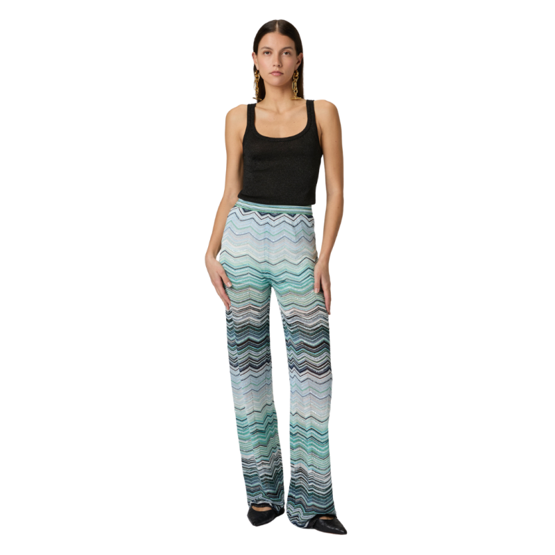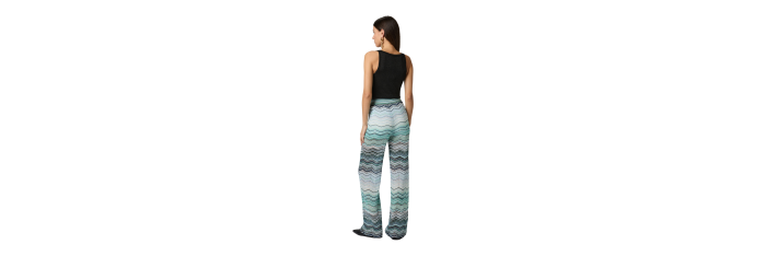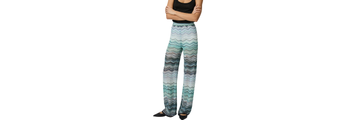Pantalon large pour femme réalisé en viscose chevron lamé avec application de paillettes et taille élastiquée. Une pièce qui allie éclat et confort, expression du savoir-faire artisanal raffiné de Missoni.
