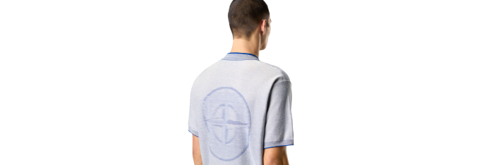 STONE ISLANDPull oversize manches courtes fil bicolore blanc bleu logo Compass dos