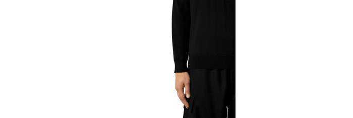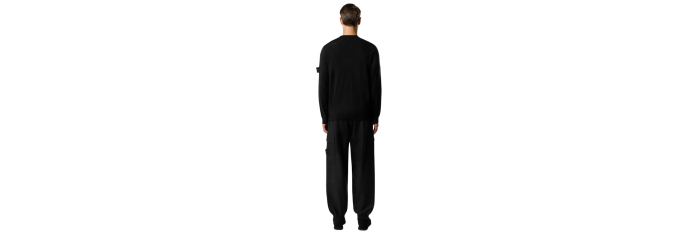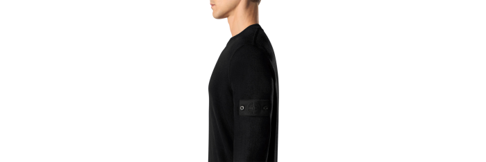 Les pièces Ghost, dérivées du concept de camouflage, sont totalement monochromes. Le badge Stone Island est lui aussi créé dans une version monochrome spéciale pour se fondre dans le vêtement. Pull ras-du-cou en pure laine RWS légère. Point jersey. Jauge 14.