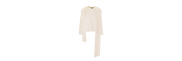 Confectionné en laine mérinos douce et fluide dans un tricotage point mousse, ce pull droit à col rond se distingue par son élégance minimaliste et son détail ludique : une écharpe amovible maintenue dans le dos par notre bijou piercing en métal argenté. Le col, les poignets et la taille sont tricotés en maille côtelée pour une allure parfaitement structurée. Disponible en noir profond, ivoire lumineux ou bleu nuit, ce pull écharpe aux manches élégamment évasées conjugue confort et raffinement apportant une dégaine des plus cools à une silhouette hivernale.