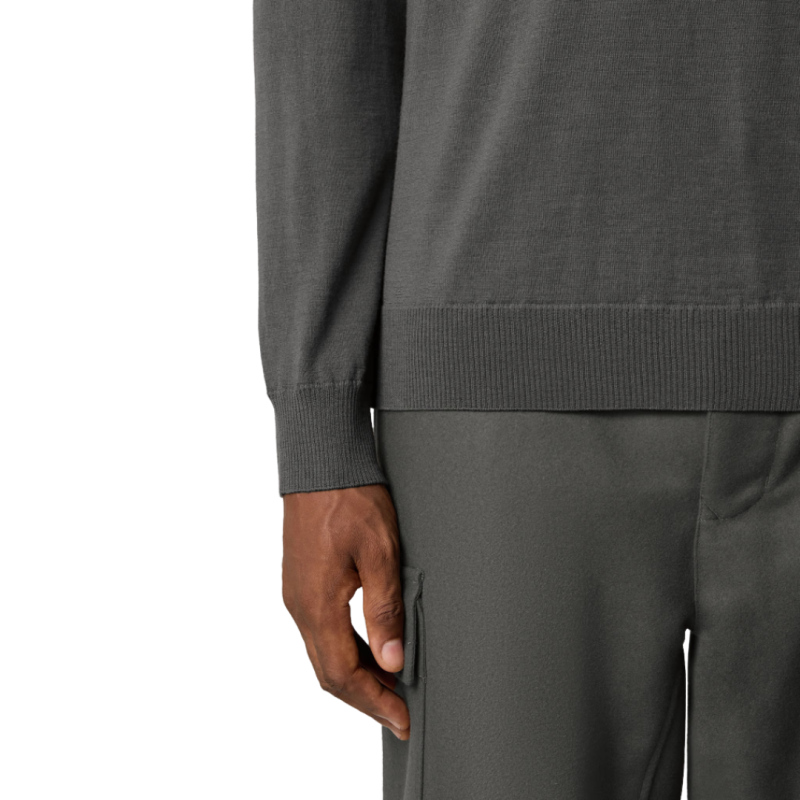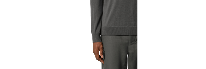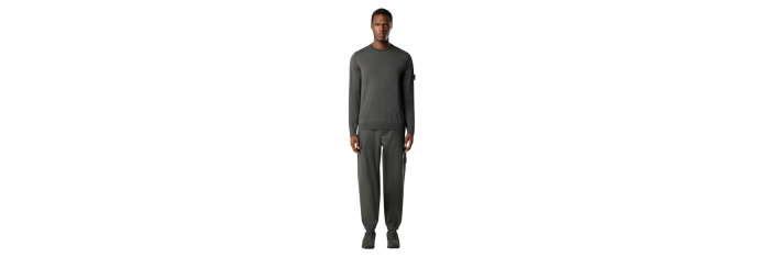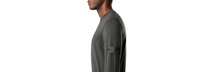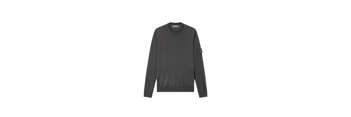 Les pièces Ghost, dérivées du concept de camouflage, sont totalement monochromes. Le badge Stone Island est lui aussi créé dans une version monochrome spéciale pour se fondre dans le vêtement. Pull ras-du-cou en pure laine RWS légère. Point jersey. Jauge 14.