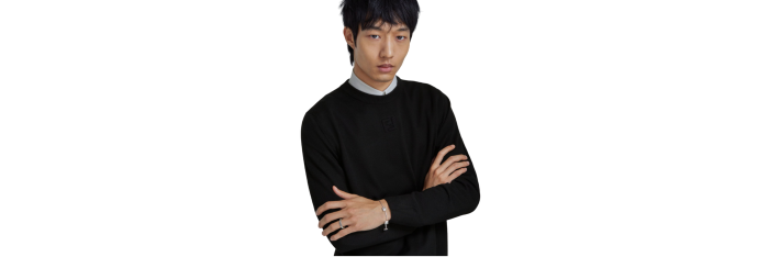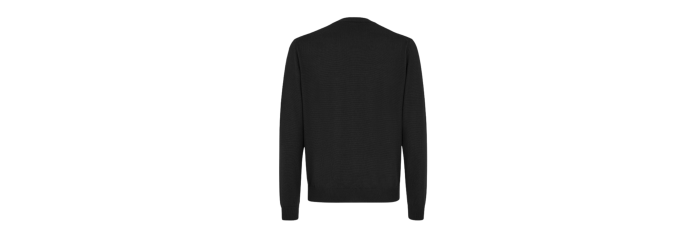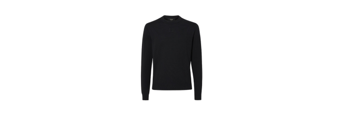 Pull à col rond et coupe classique. En fil de laine léger noir. Détail FF en relief sur la poitrine et bords finement côtelés.