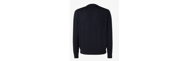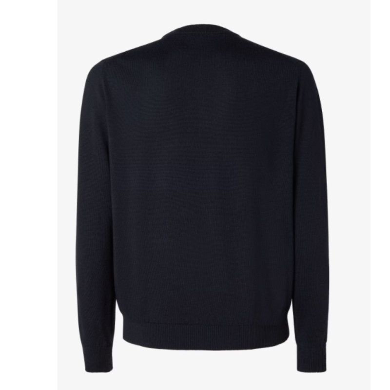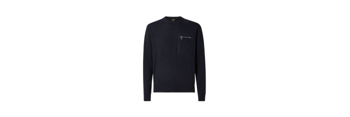 Pull à col rond avec manches longues. Coupe classique. En fil de laine bleu marine. Poche poitrine zippée ornée du motif FF en relief dans le ton et du curseur Fendi O’Lock en métal finition palladium.