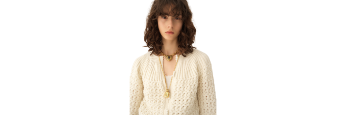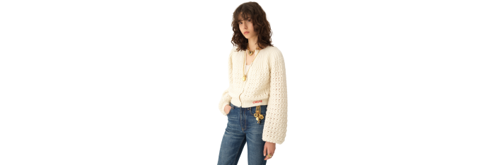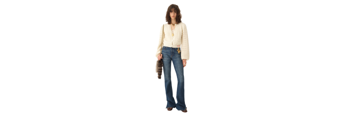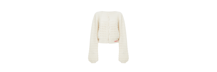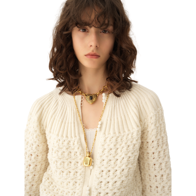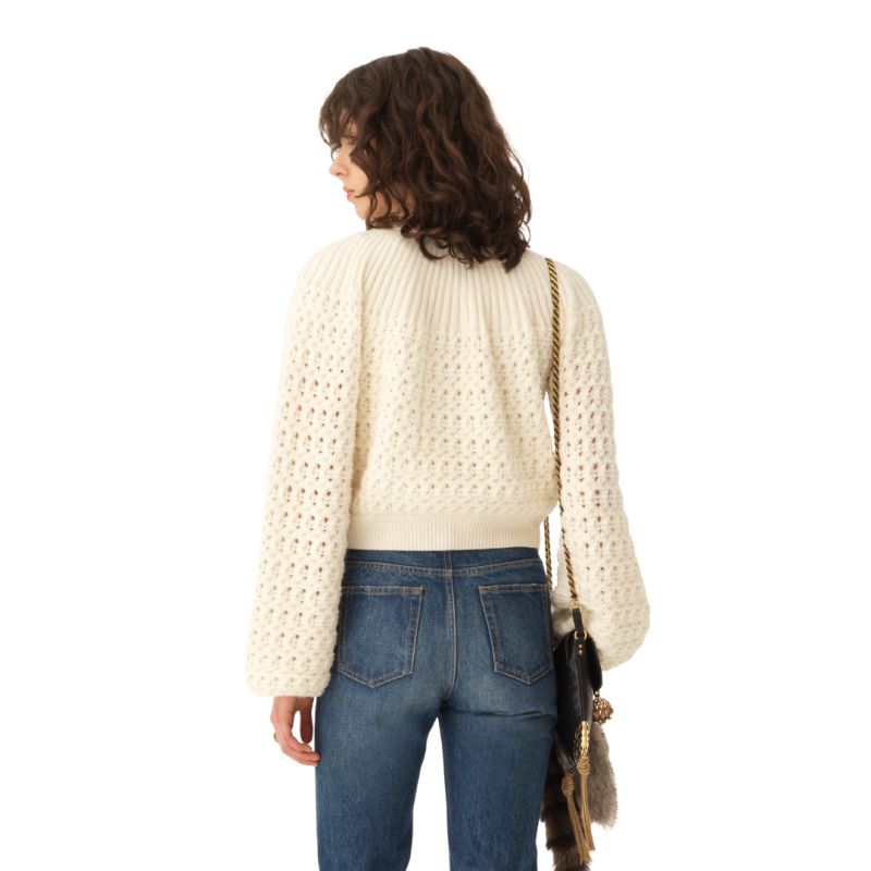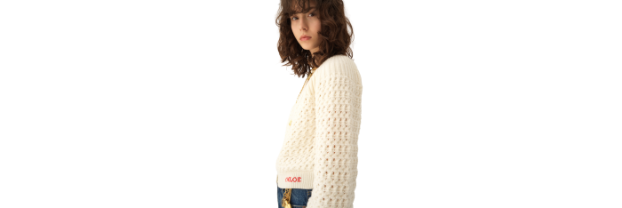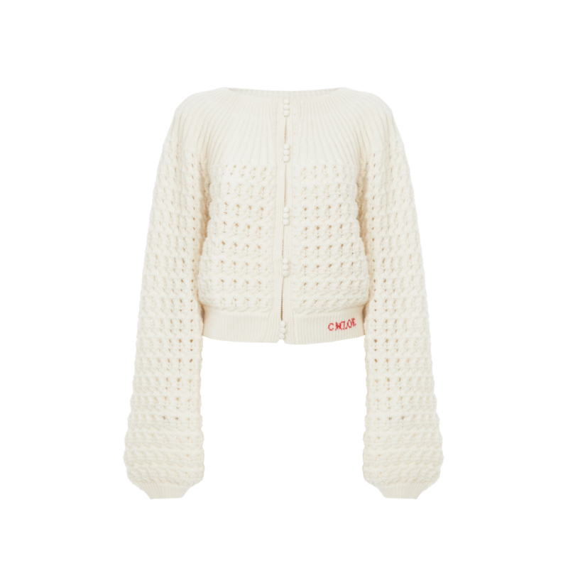 CHLOECardigan col rond maille épaisse laine cachemire écru broderie logo rouge taille