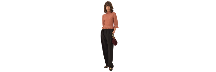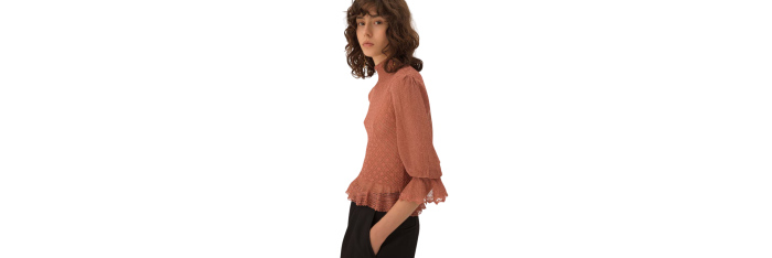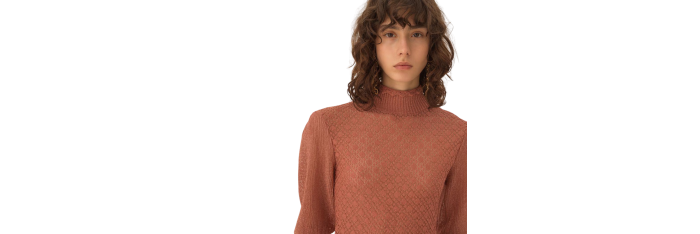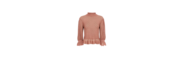 Pull col montant à volants en maille lurex, avec manches bouffantes et boutons recouverts.